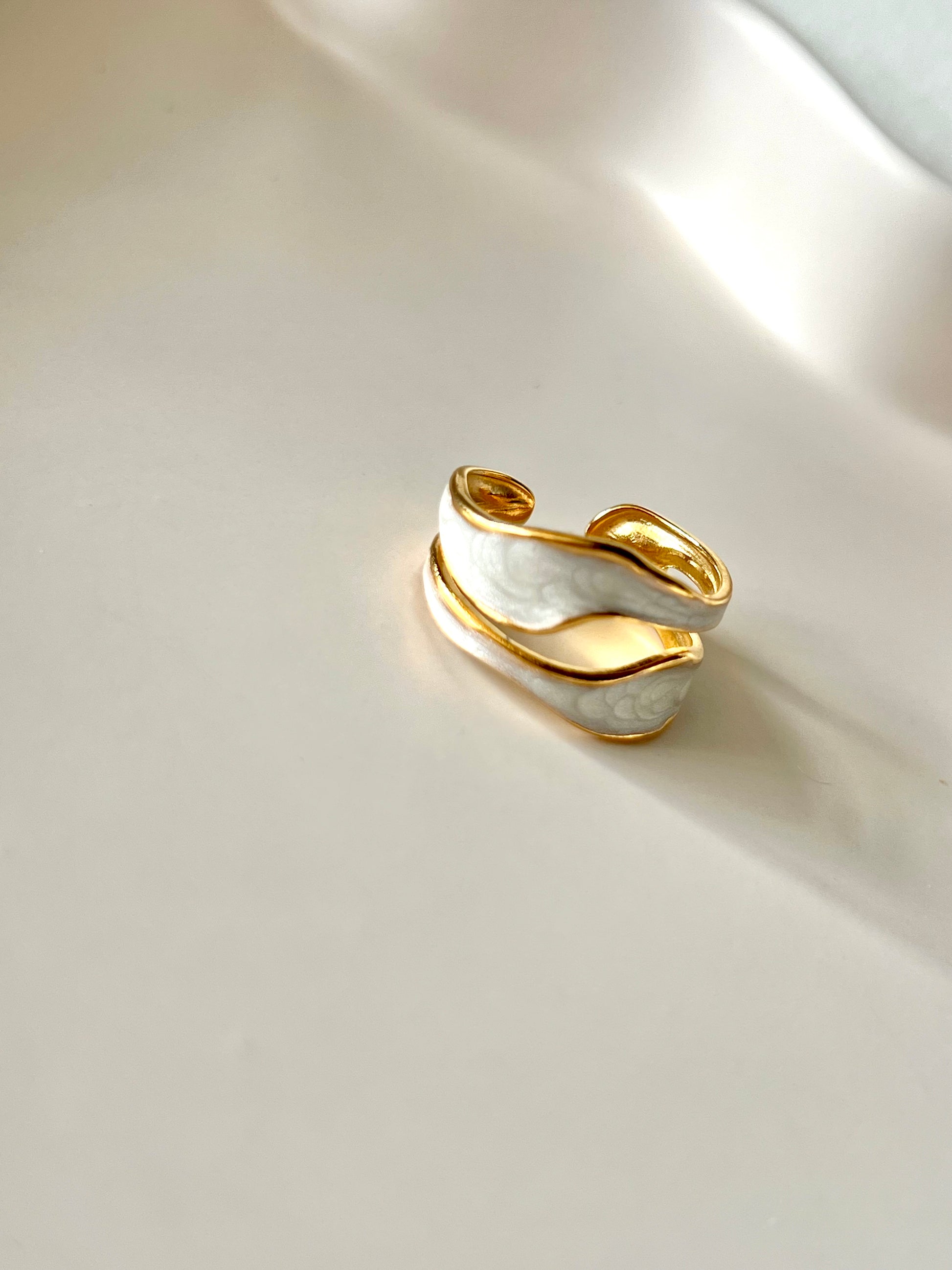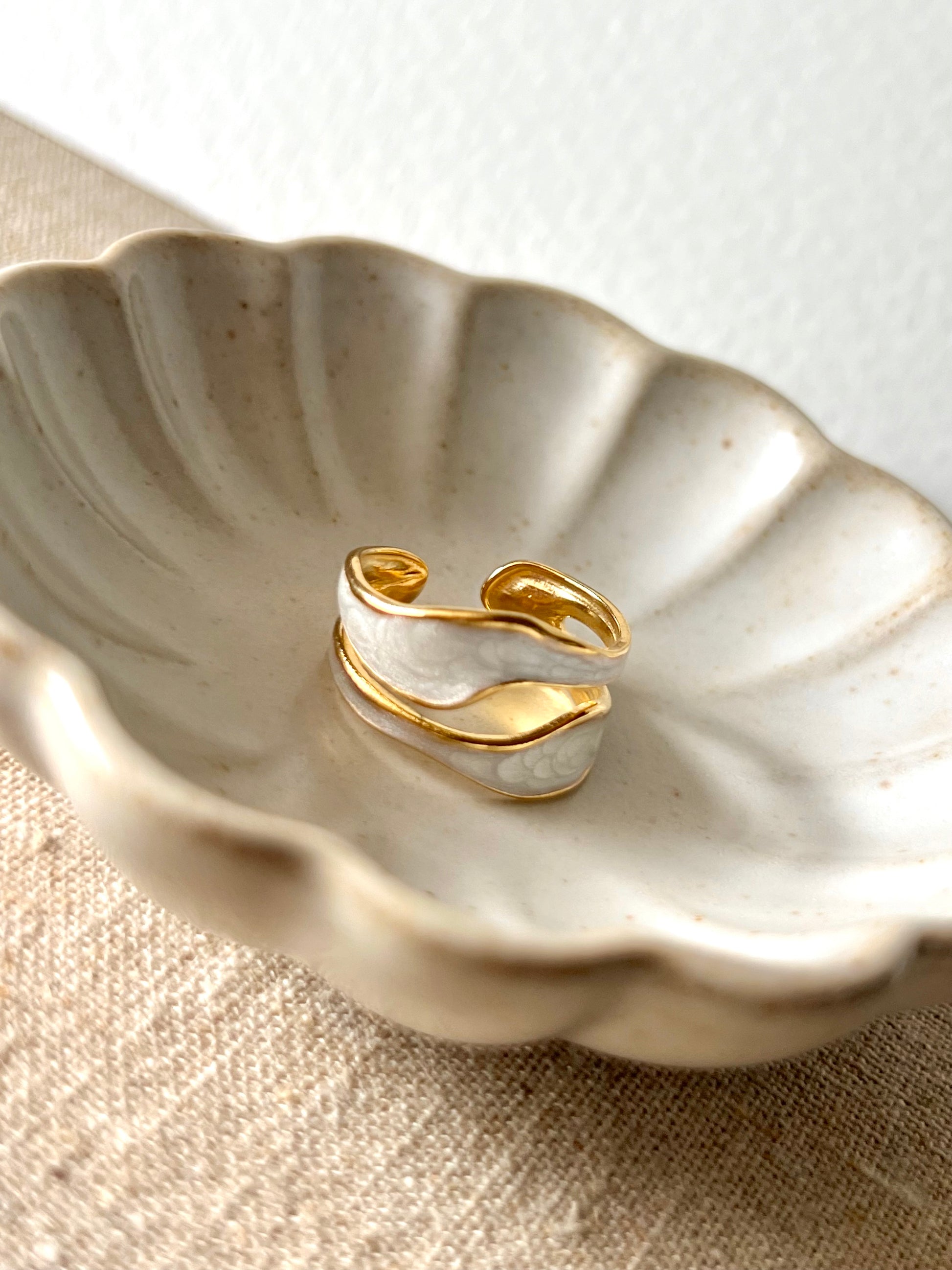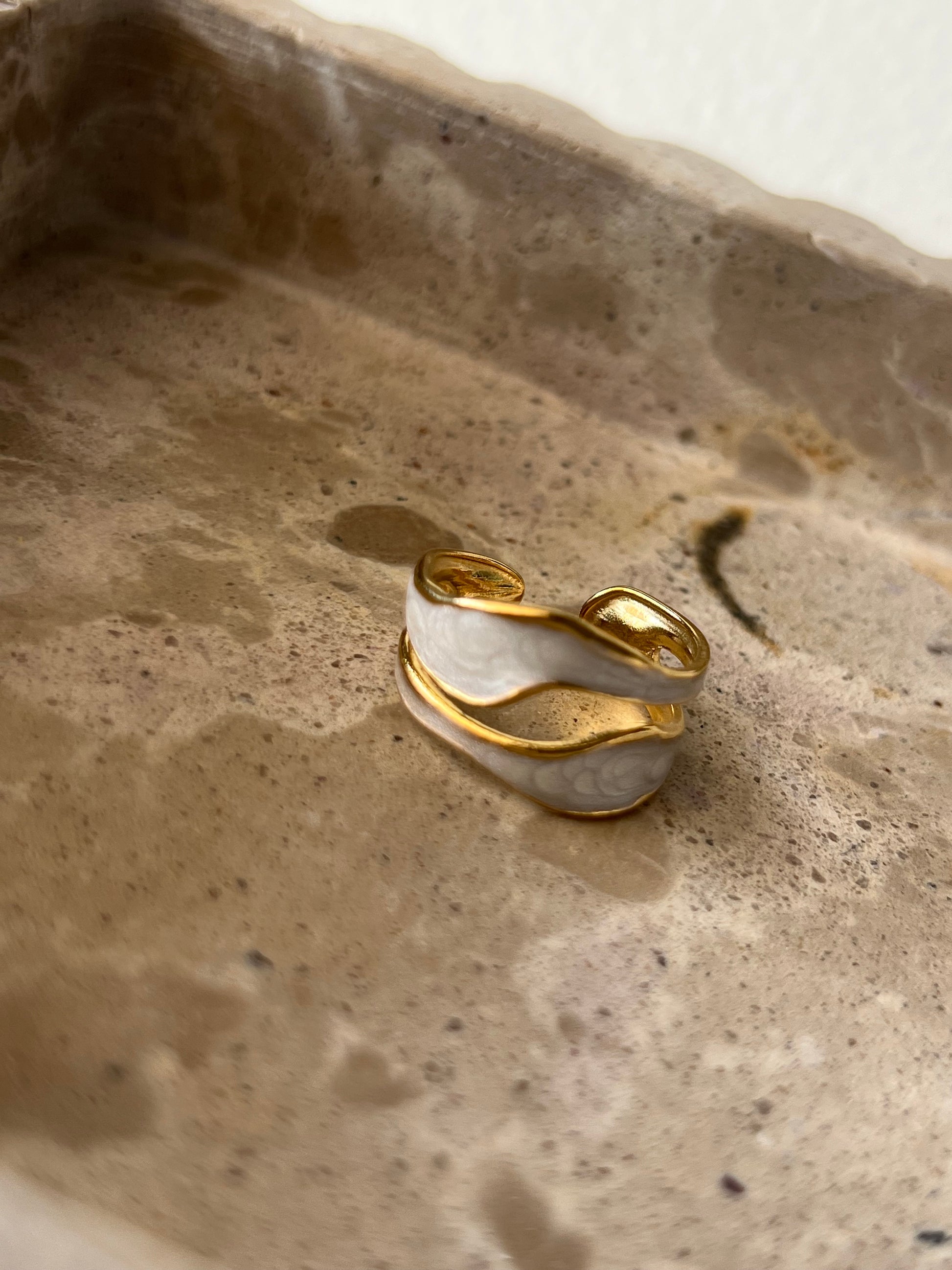Open stainless steel ring with gold PVD plating and white enamel. 1.8cm