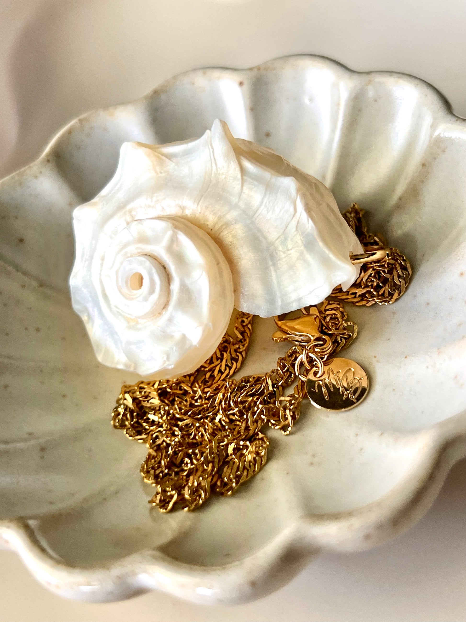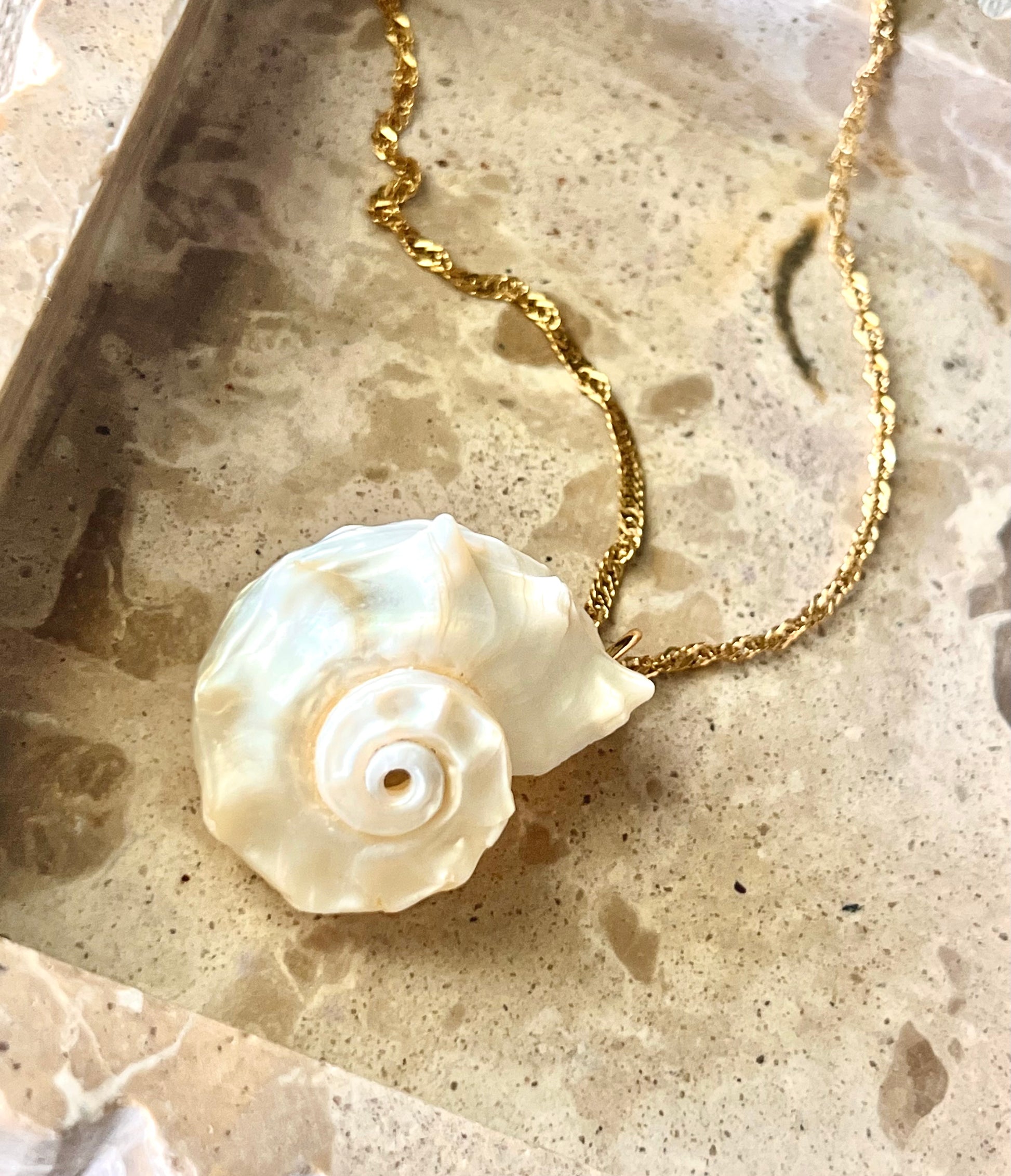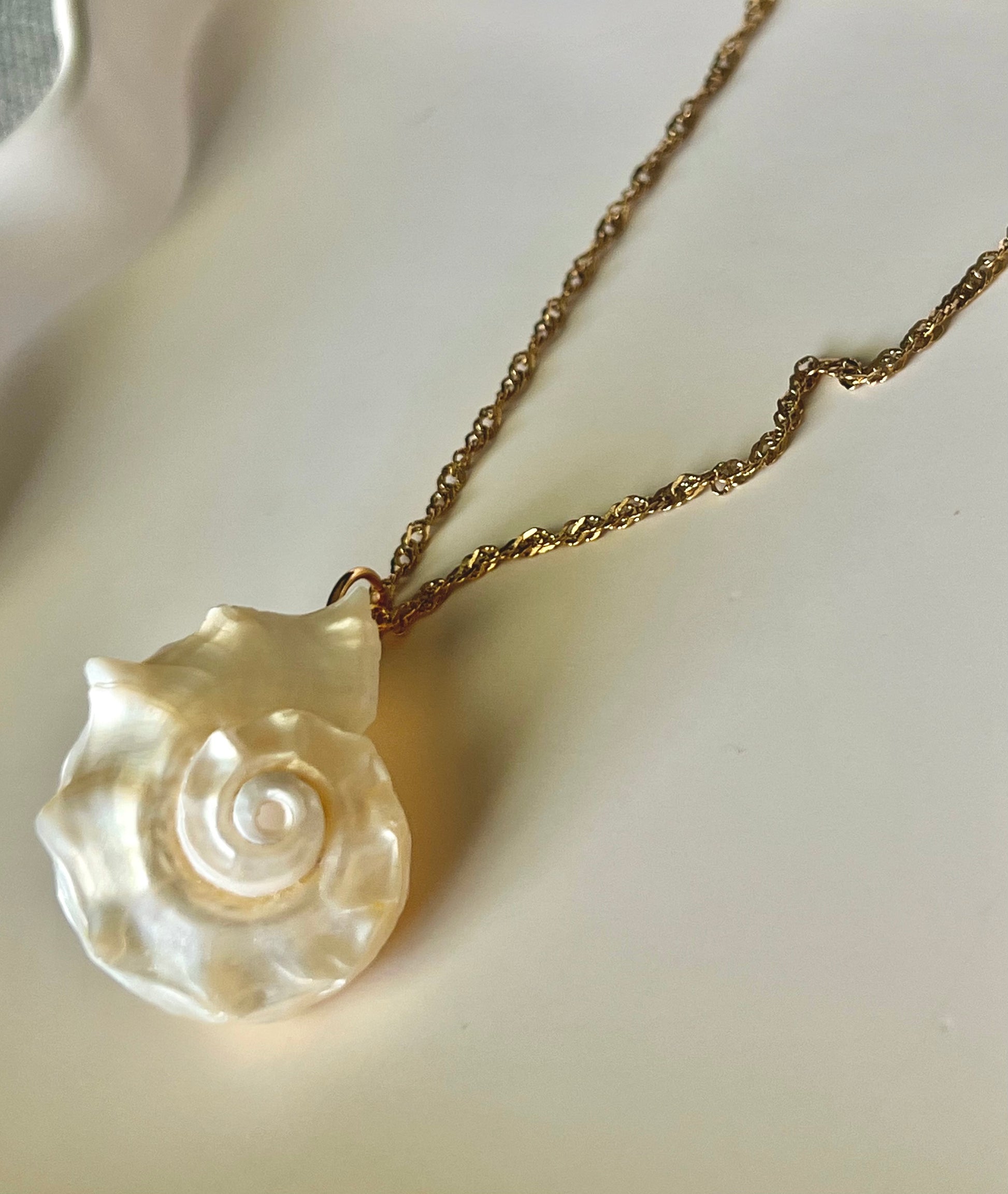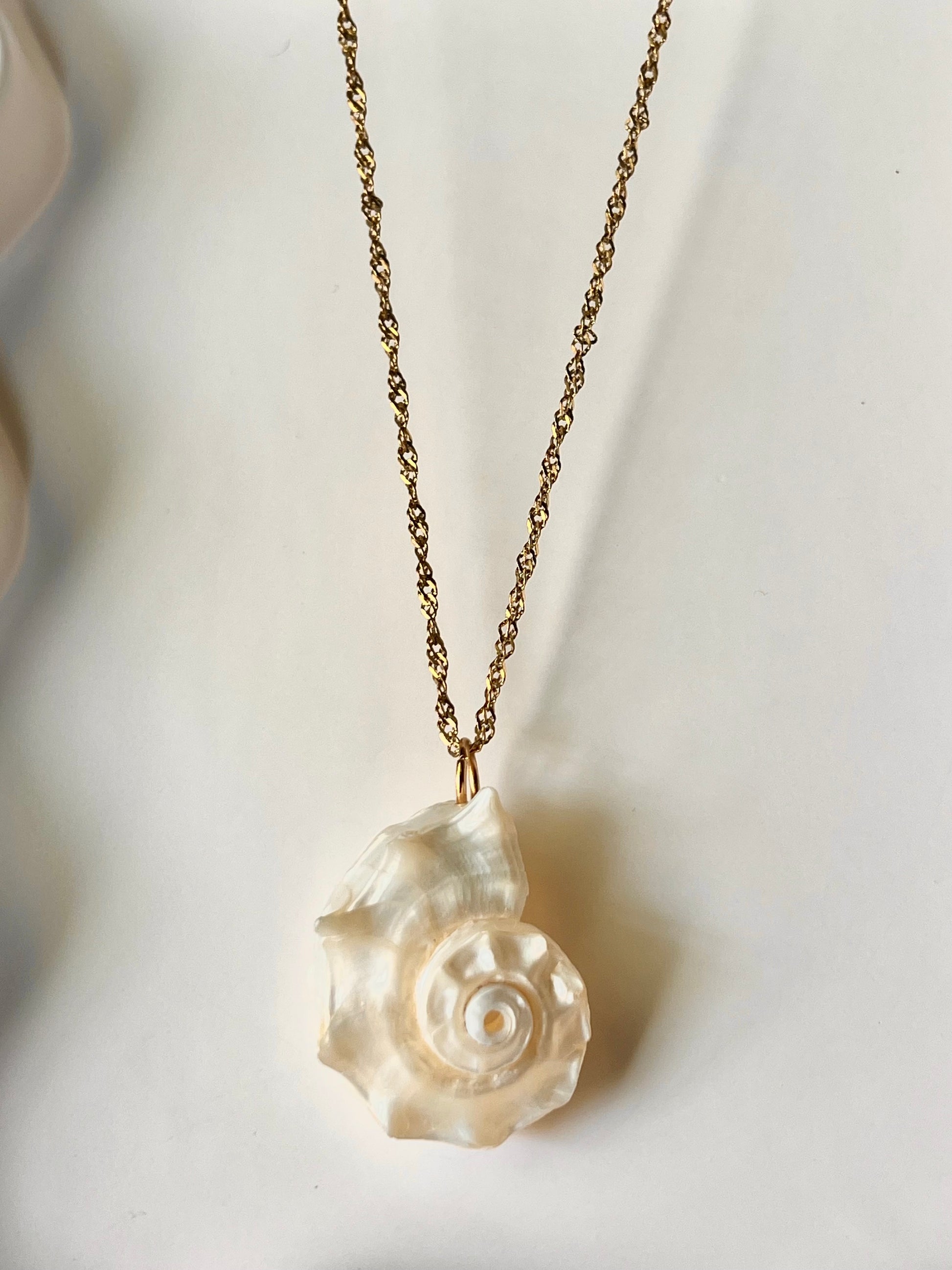 This elegant, handcrafted piece features a 14k gold-filled twisted chain, measuring 20 inches in length. Each piece is unique. Due to the use of natural shell, slight variations in size, color, and shape may occur enhancing the individuality and charm of every piece.