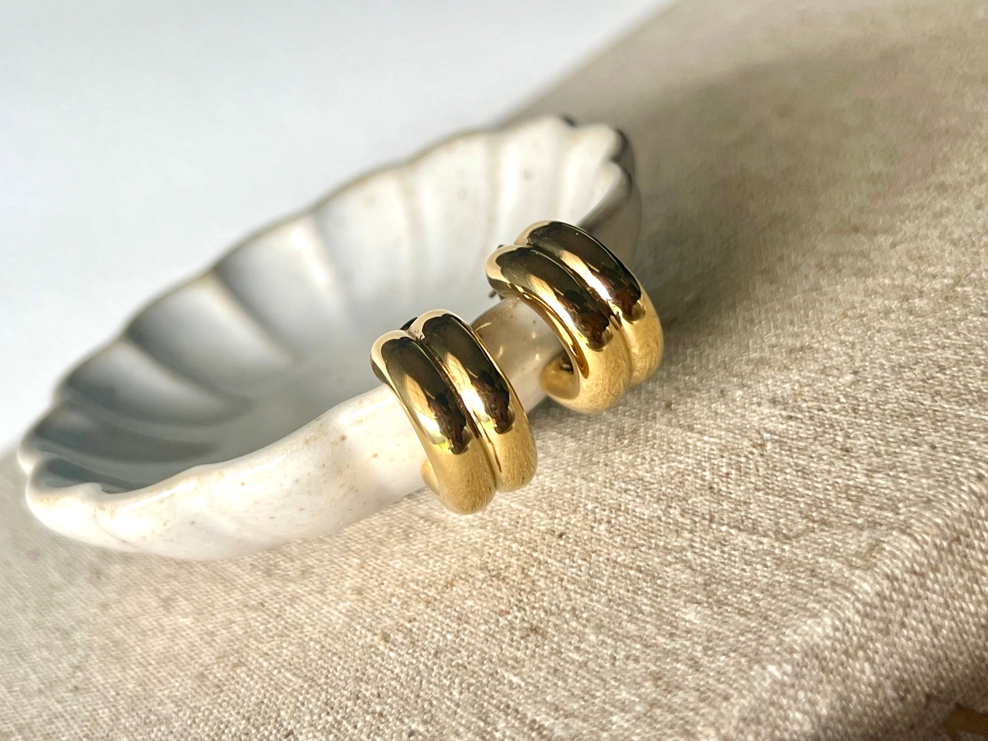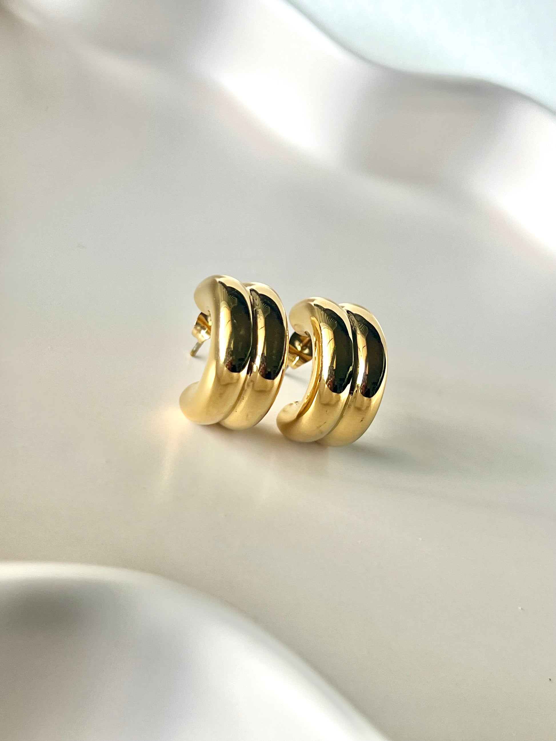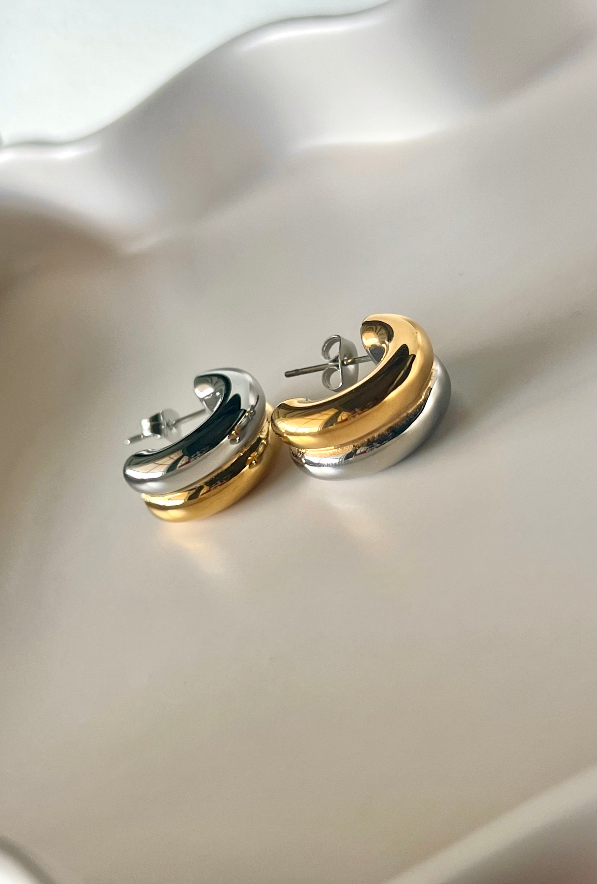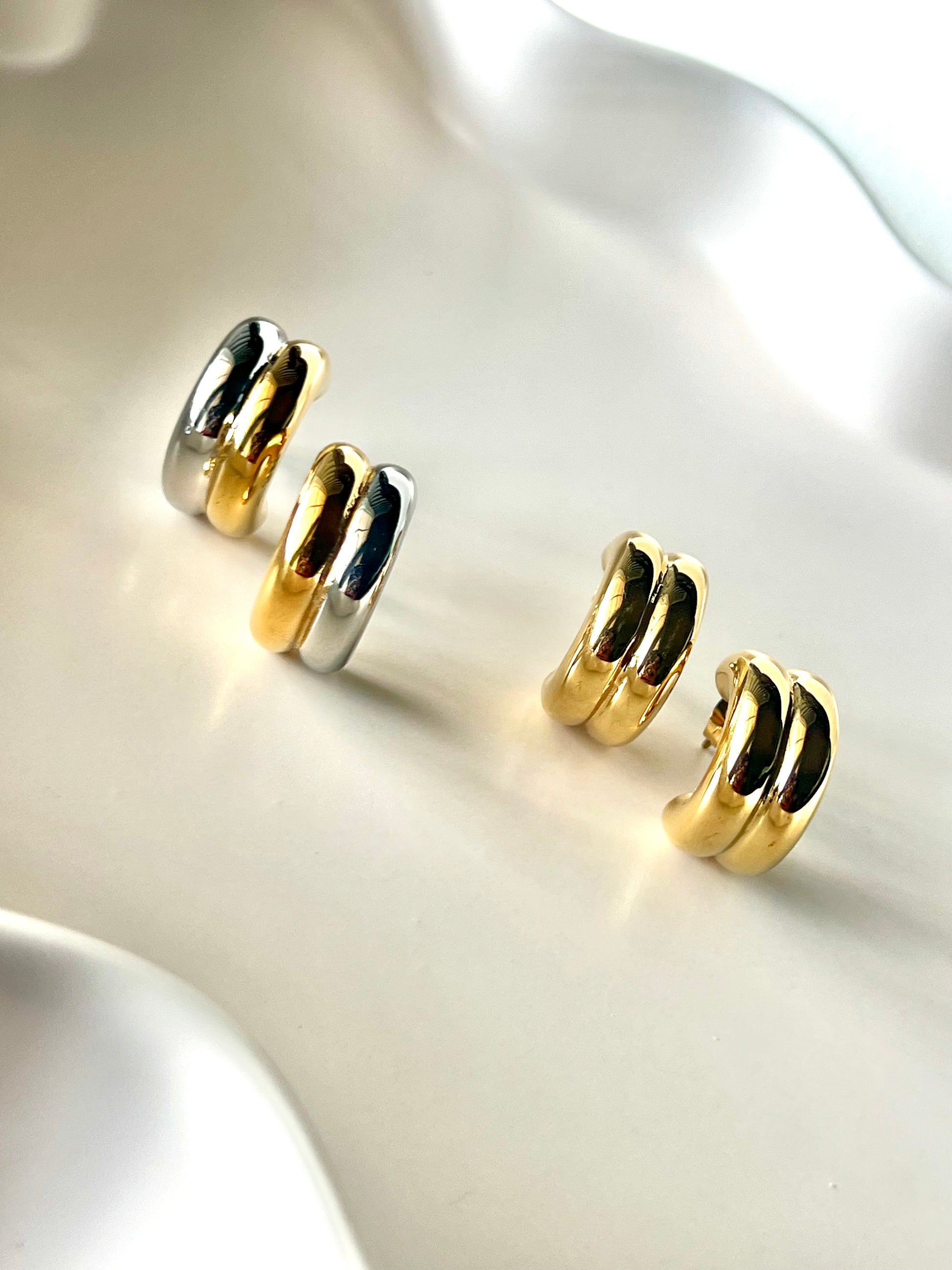 Gold and silver stainless steel stud earrings, tarnish-free, 0.71mm thick, 15mm wide, and 21mm high