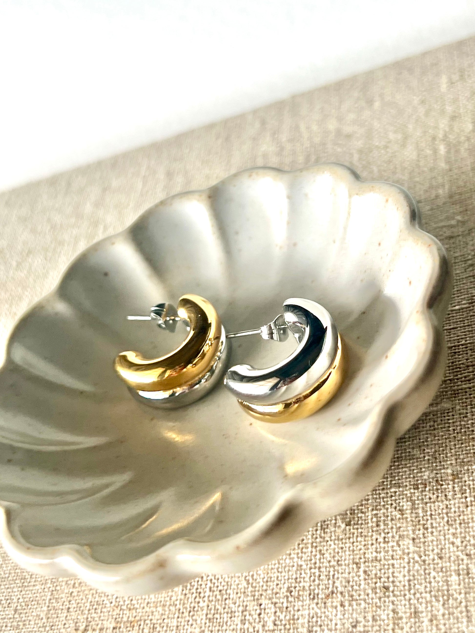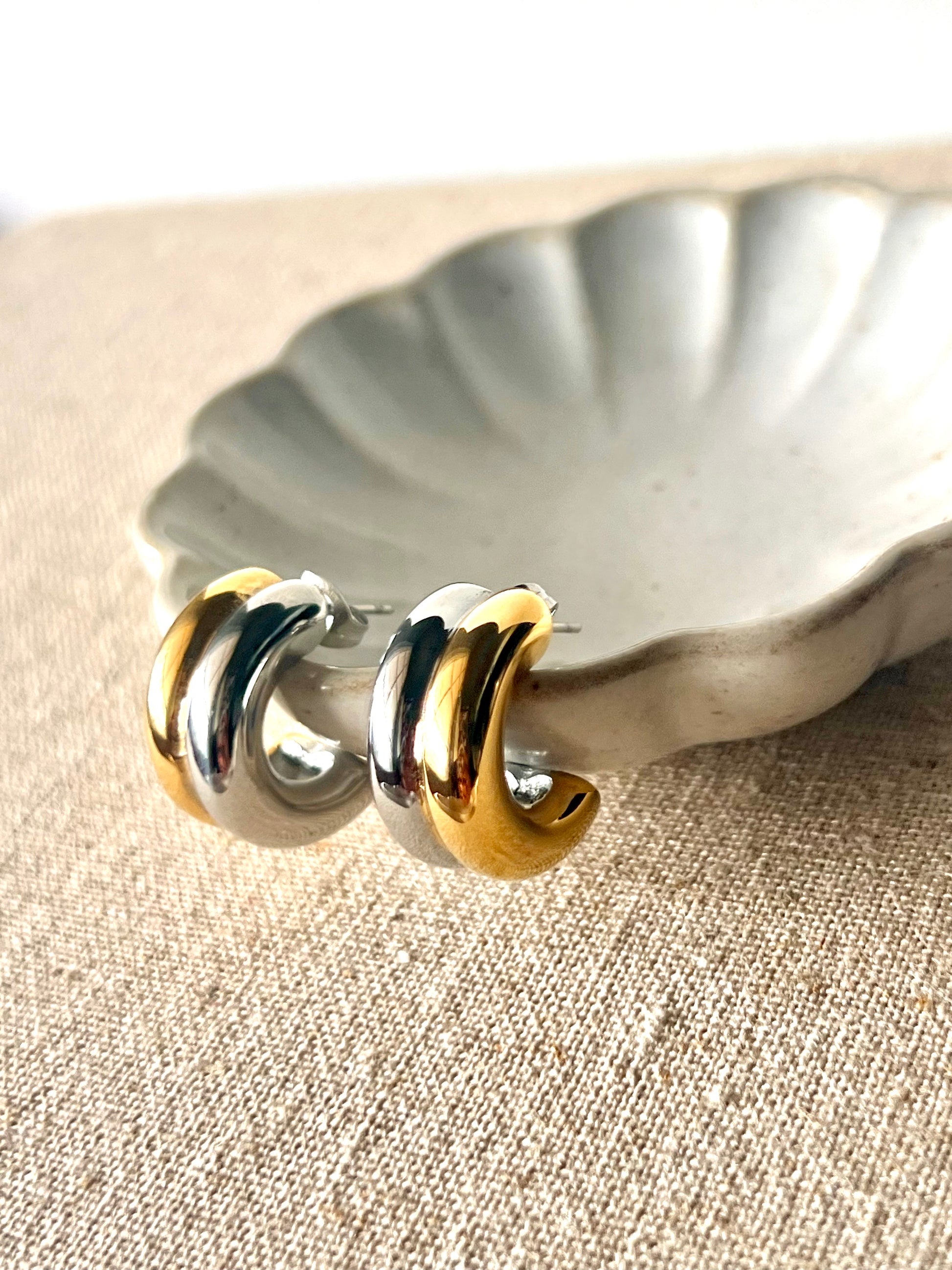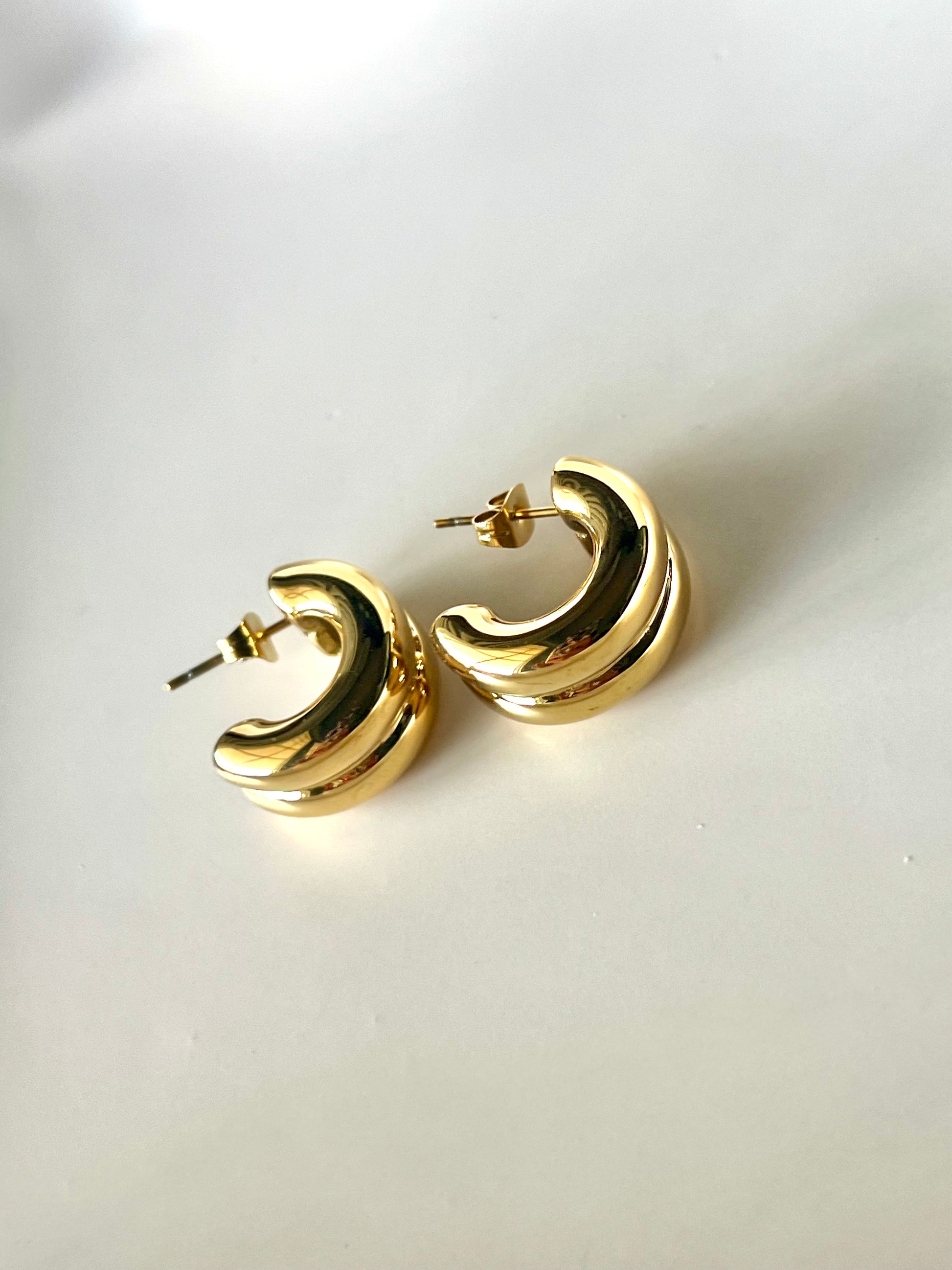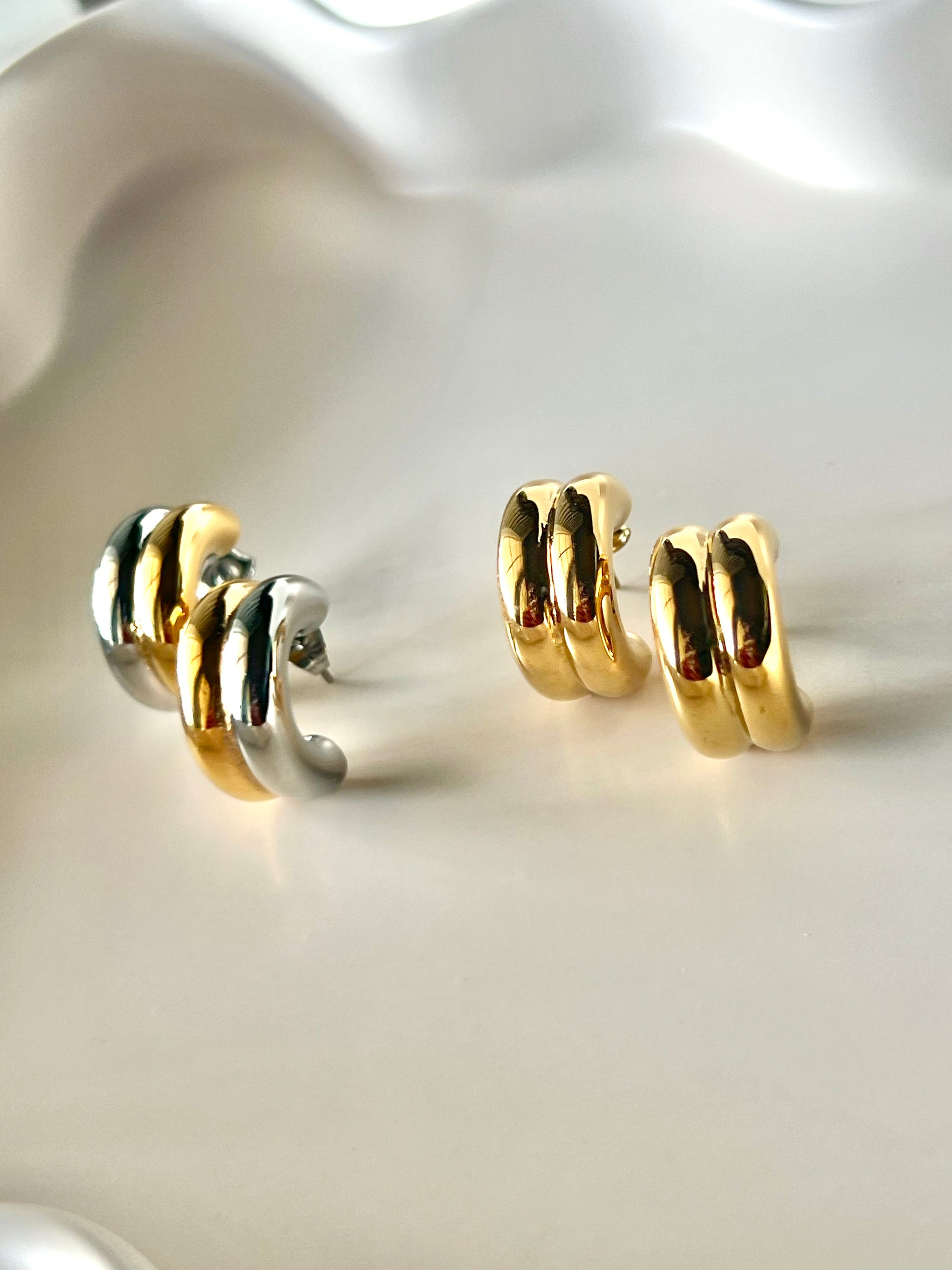 Gold and silver stainless steel stud earrings, tarnish-free, 0.71mm thick, 15mm wide, and 21mm high