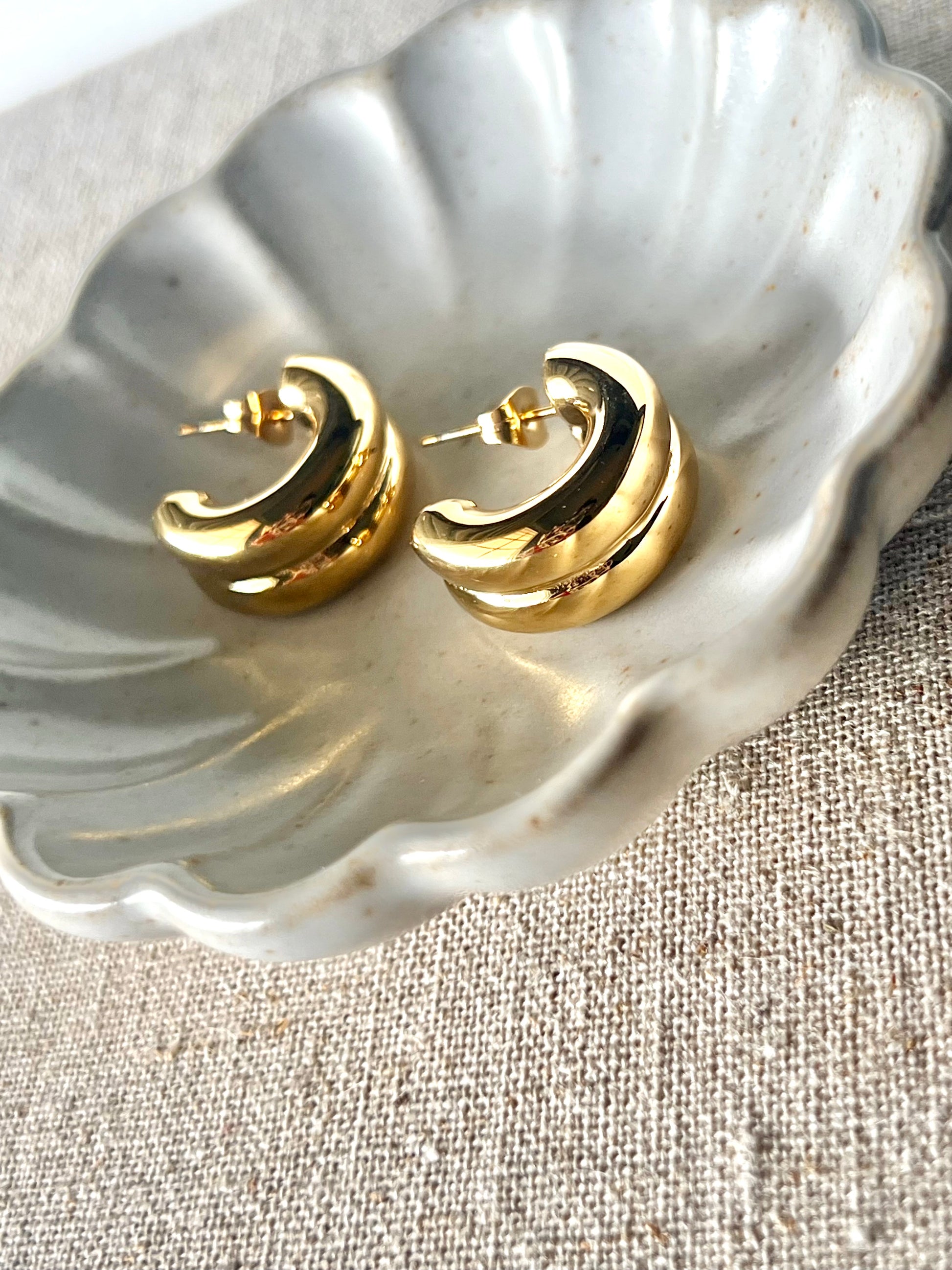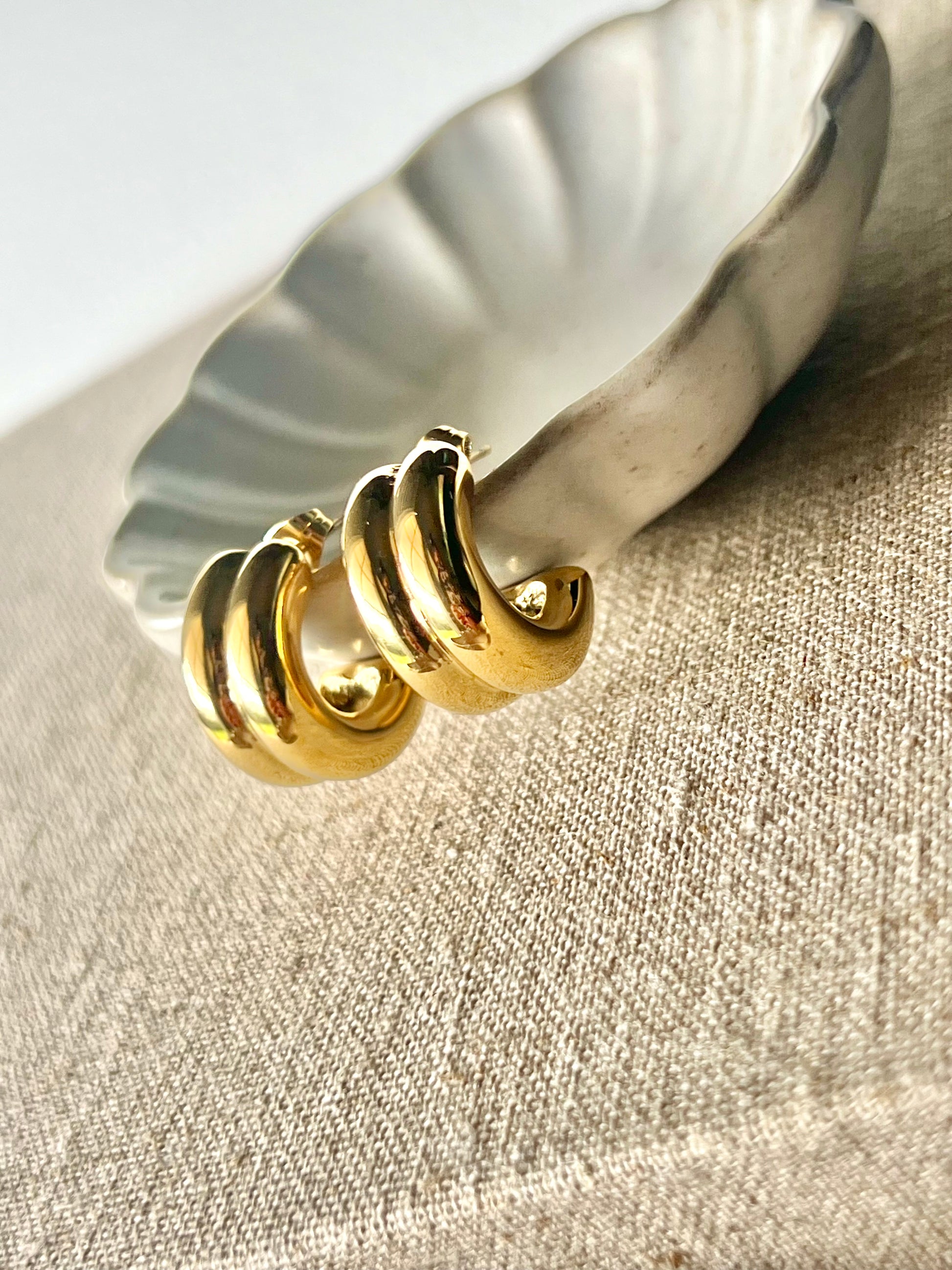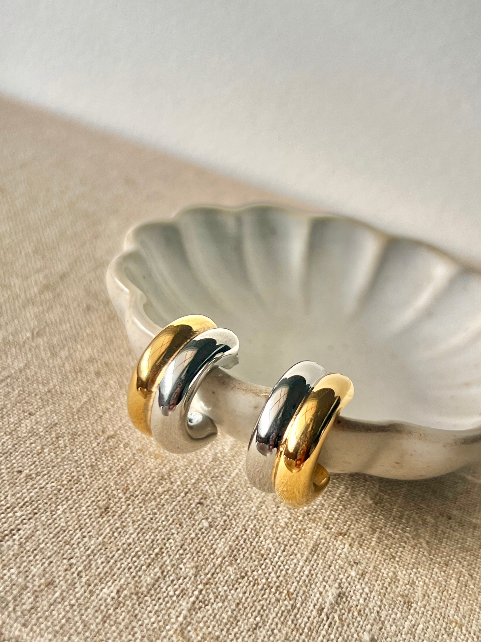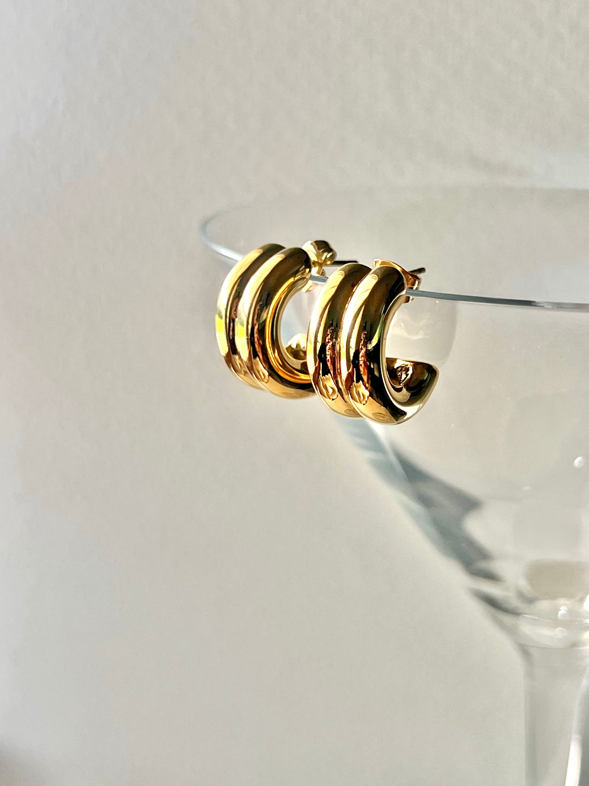 Gold and silver stainless steel stud earrings, tarnish-free, 0.71mm thick, 15mm wide, and 21mm high