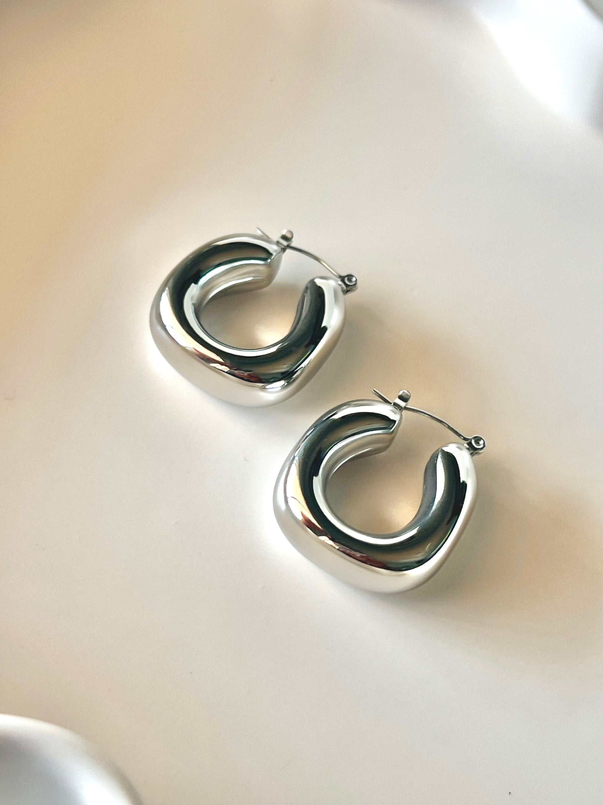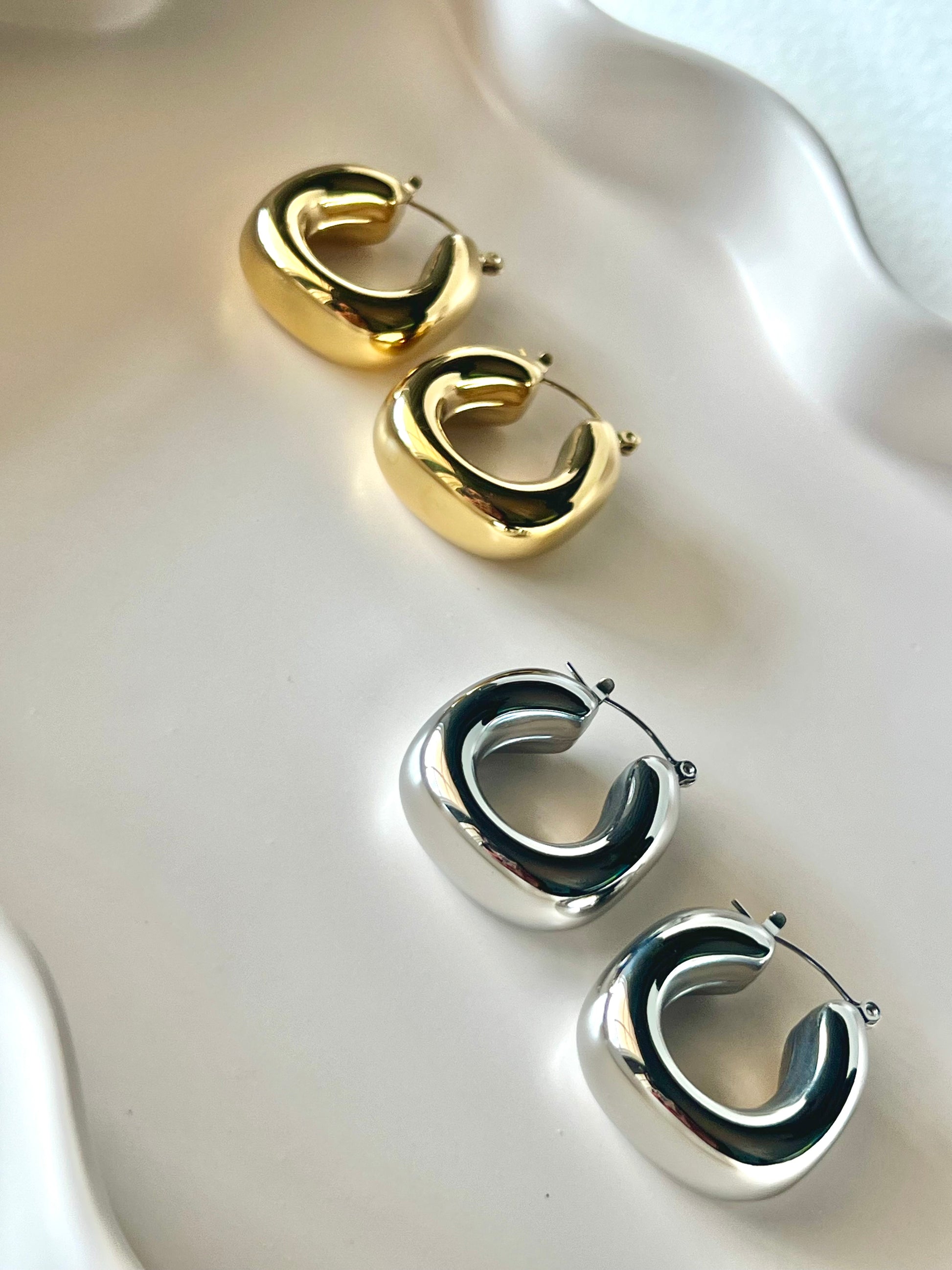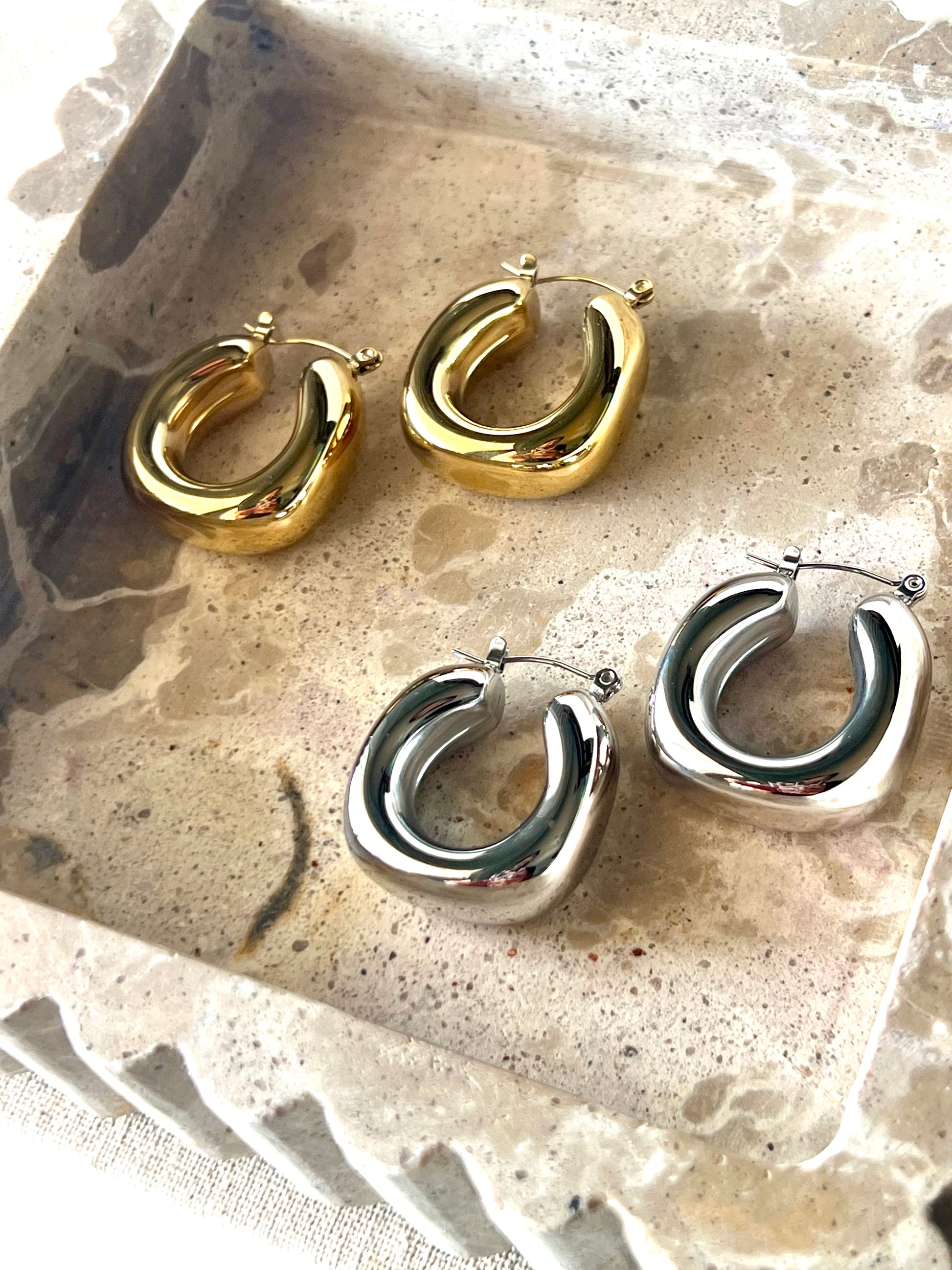 Chunky stainless steel hoop earrings with real gold PVD plating, 27mm wide and 30mm high.