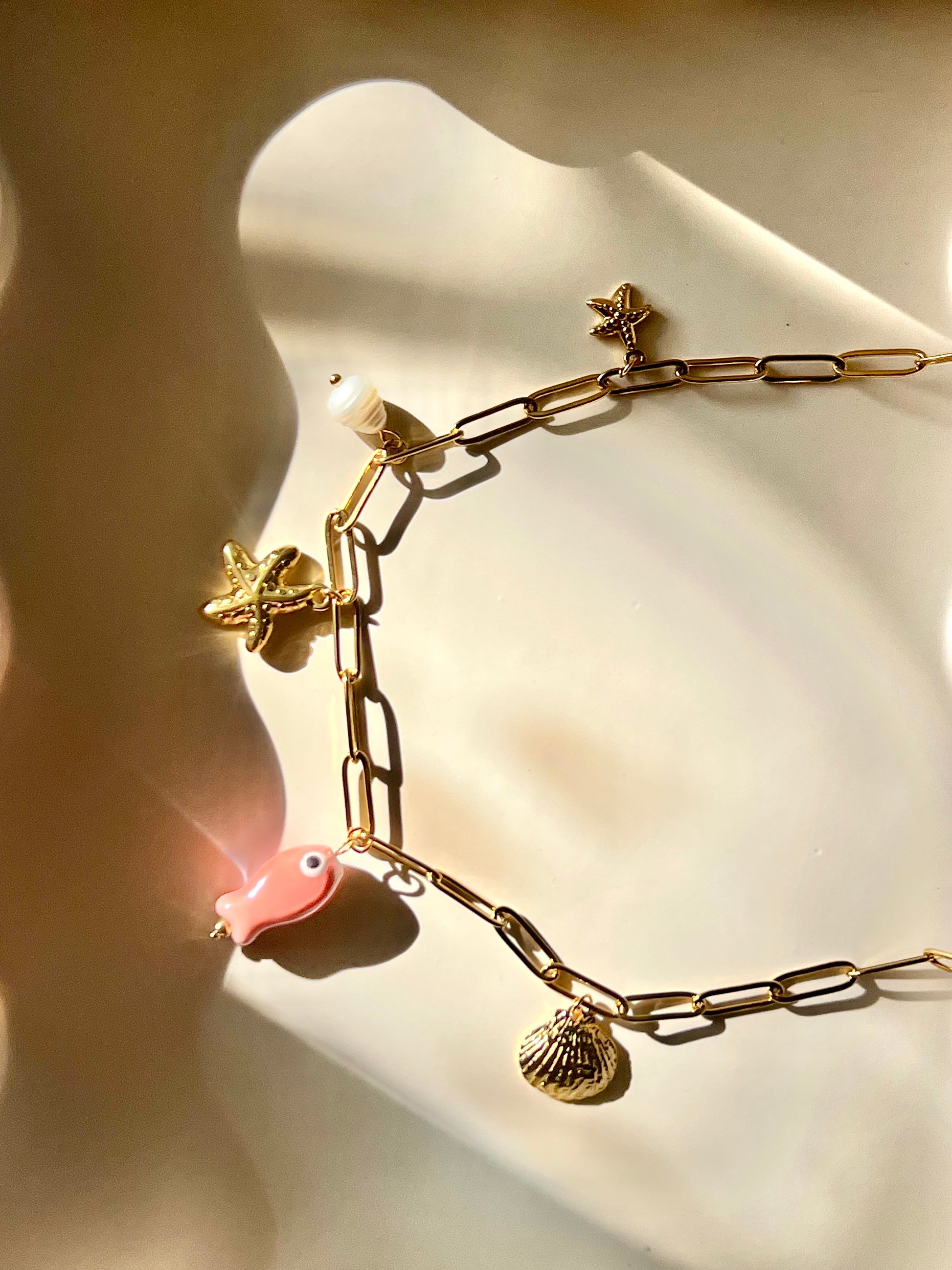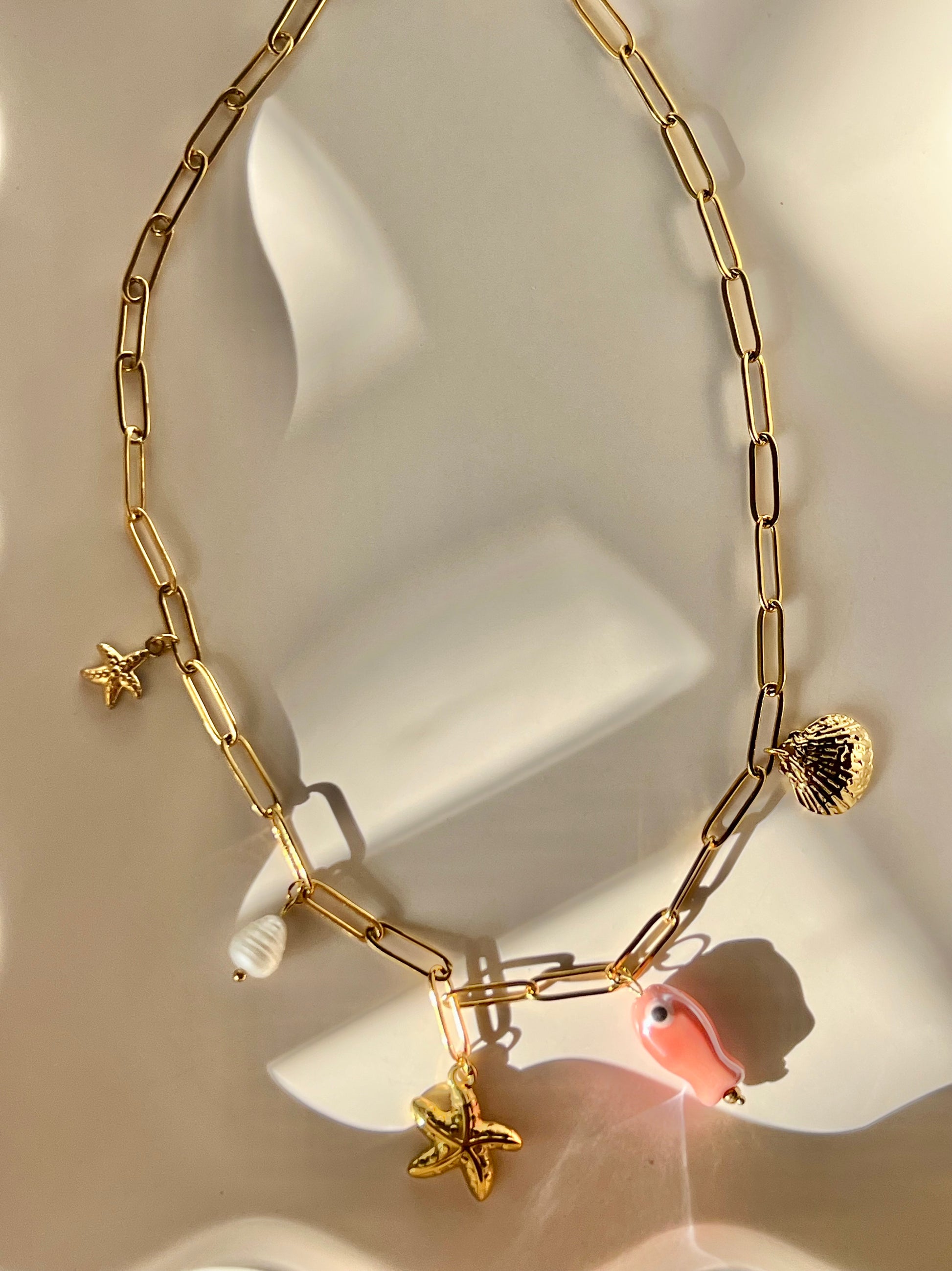 16.93-inch stainless steel necklace with real gold PVD plating, featuring starfih, shell and pearl pendants.