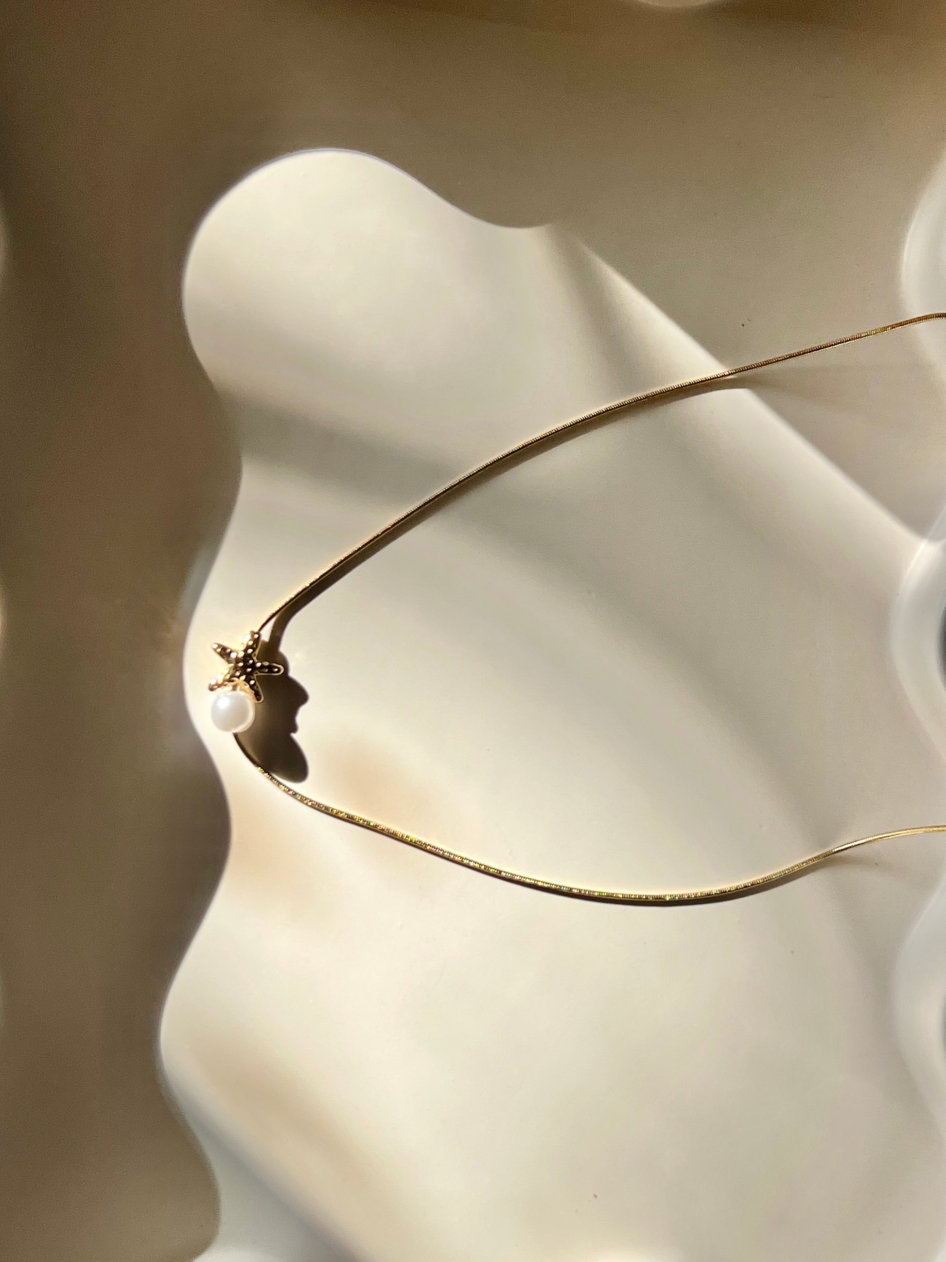 16.1-inch stainless steel necklace with real gold PVD plating, featuring a starfish and pearl pendant.