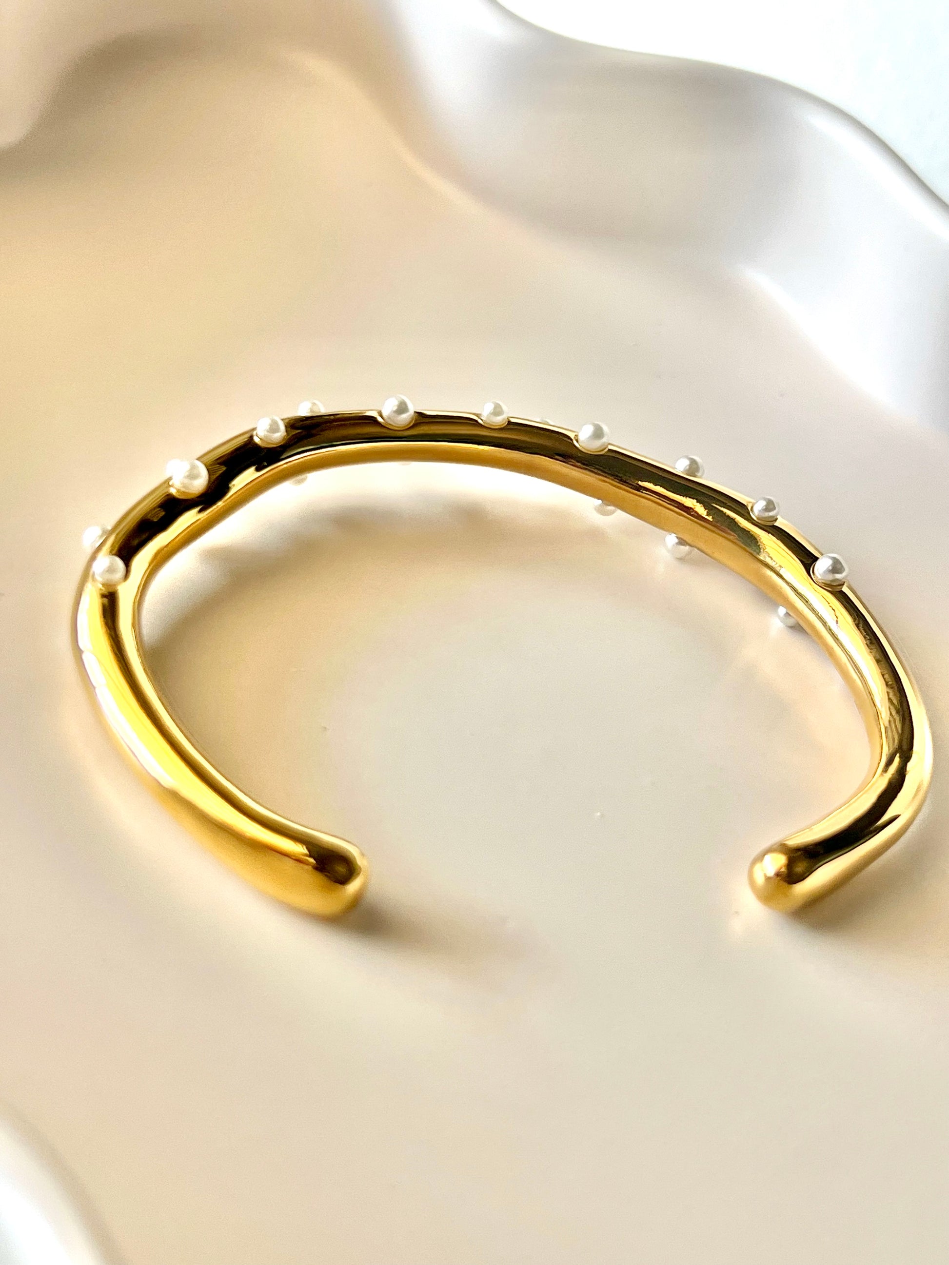 Stainless steel open cuff bracelet featuring elegant pearls and finished with durable PVD gold plating. Inner diameter: 62mm.
